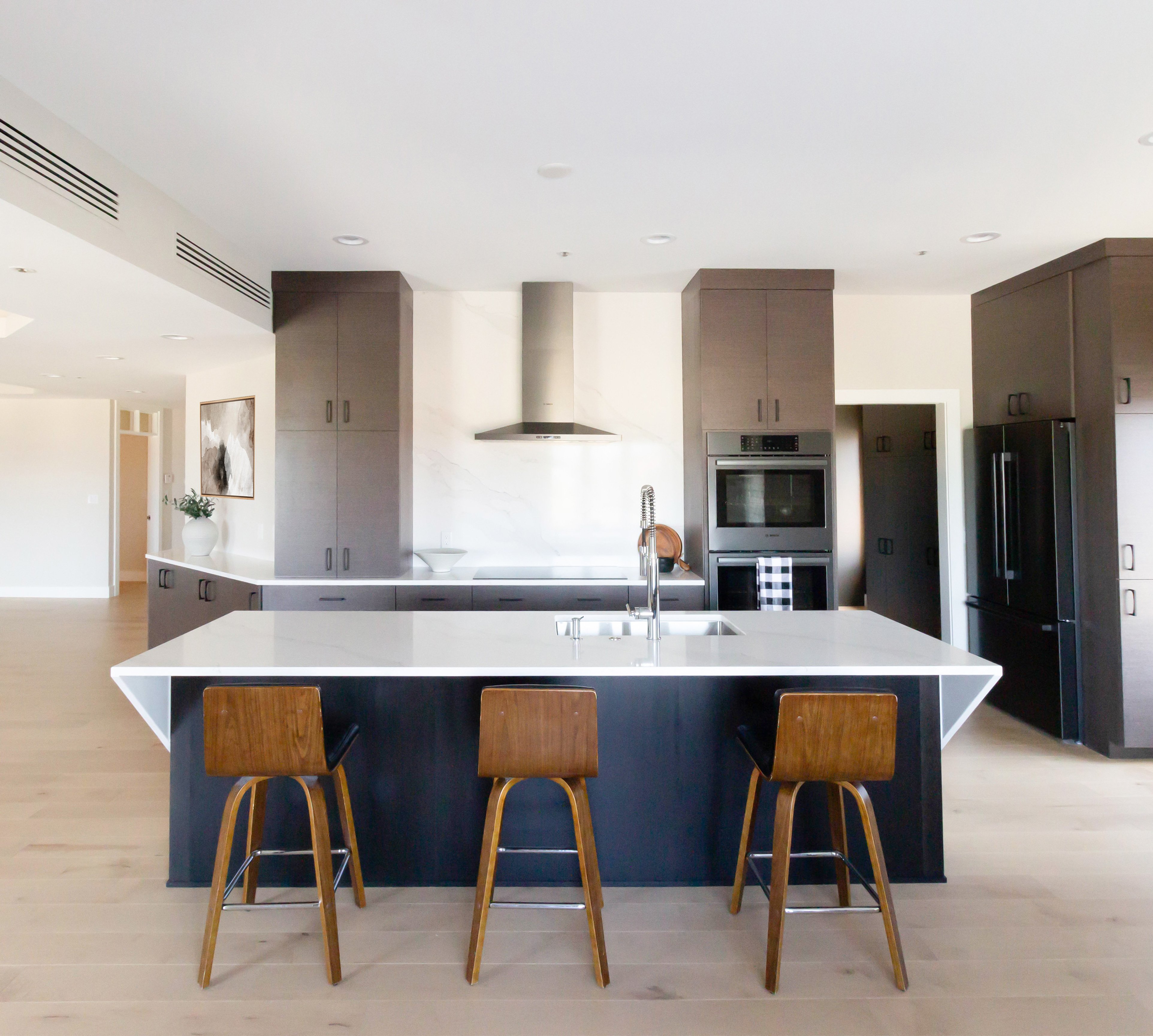 At the center of the space, the island makes a bold yet elegant statement. The quartered white oak adds warmth again, while the white quartz countertop creates contrast and extends into a dramatic waterfall edge. This crisp, modern surface is also utilized in the full-height quartz backsplash, creating a clean focal point behind the cooktop and vent hood for a cohesive design throughout.