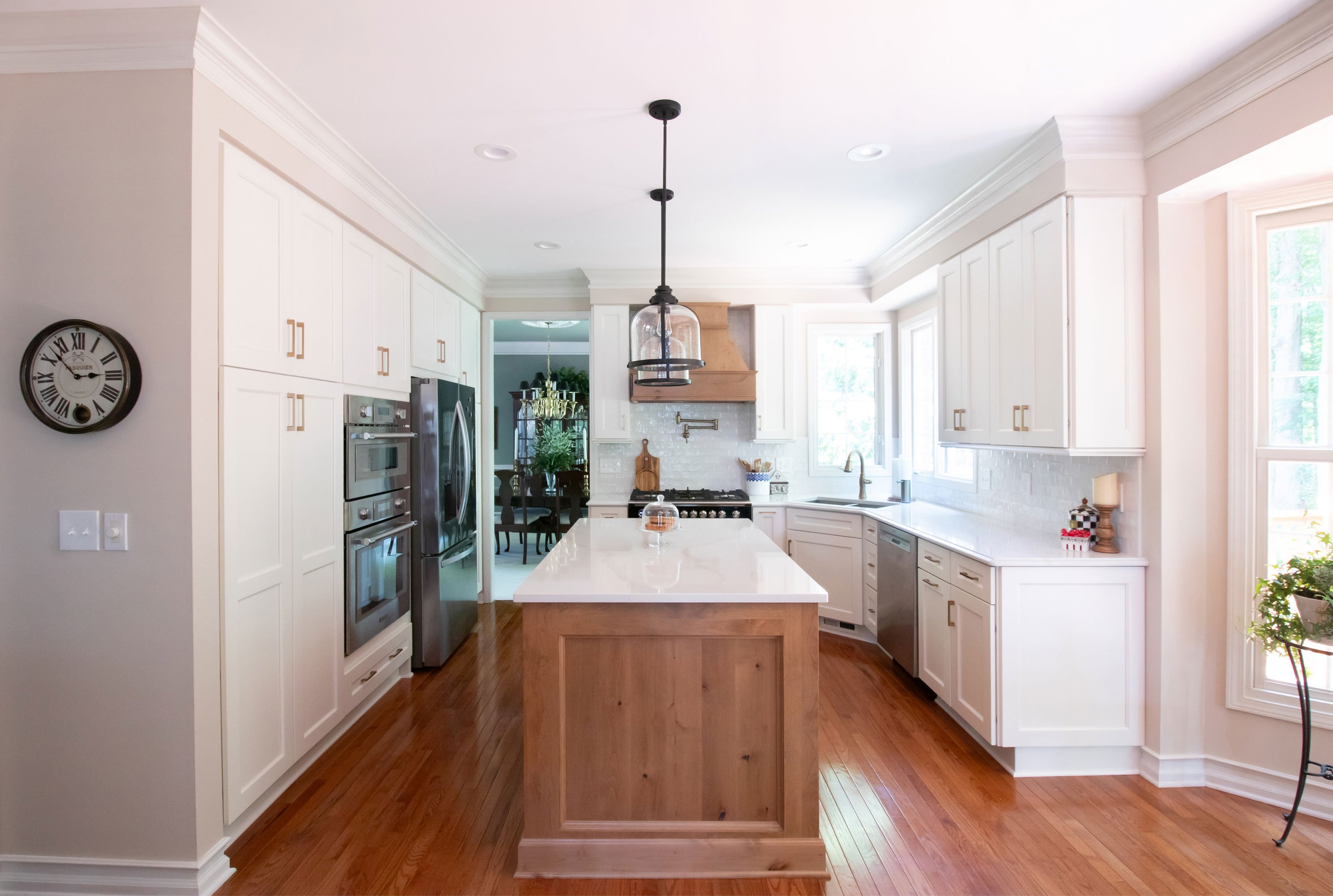 I mixed natural wood tones with warm white cabinetry, then layered in classic touches like the warm brass hardware and the legs on the black étagère cabinet. We added rustic charm with glass pendant lighting, a pop of color with the range, and extra function with a pot filler and double oven. The chimney-style hood anchored the design while seamlessly tying everything together.